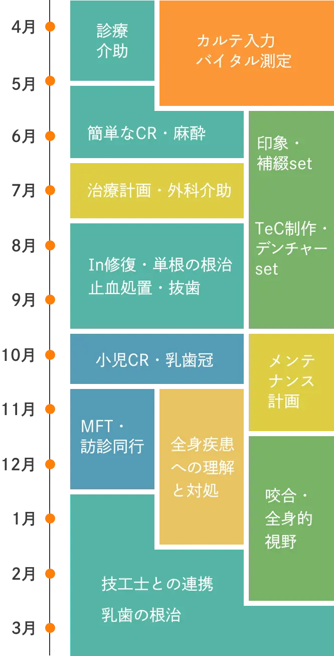 4月には急患対応で判断力を磨き、夏には外科処置や粘膜疾患への対応、秋には小児や保隙治療、冬には口腔機能リハビリやインプラント補綴まで進みます。